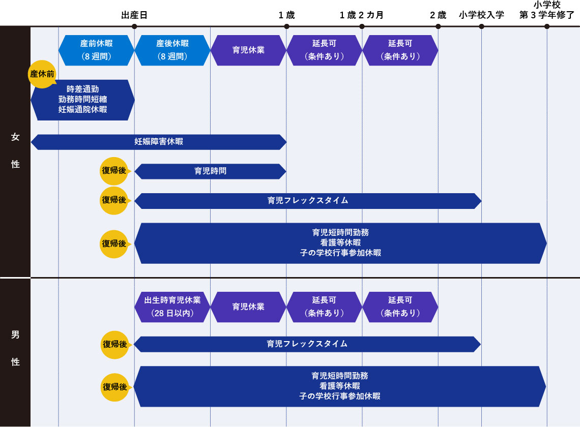 育児・介護休業法上の基準では「子が3歳に達する日まで」とされていますが、当社では「小学校第3学年修了まで」と定めています。